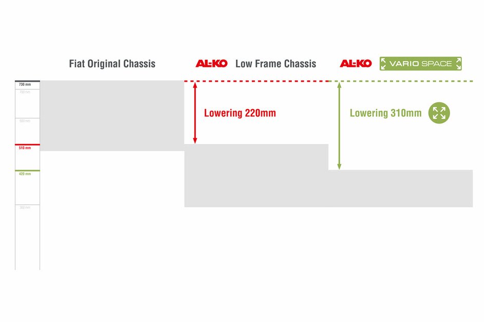 With VARIO SPACE, the latest generation of low-frame chassis, the AL-KO VT range offers a new space miracle for the FIAT Ducato, Peugeot Boxer and Citroën Jumper as well as the Mercedes-Benz Sprinter chassis cabs. “Thanks to our expertise and ongoing research into the lightweight design and aerodynamics, we have been able to further develop our chassis and offer a high degree of scalability with the AMC VARIO SPACE. Its lowered frame offers more overall flexibility in body design. The reduced vehicle height enables improved aerodynamics. This in turn makes it possible to reduce CO2 emissions,” reports Dr Georg Rixecker, Senior Vice President R&D at the AL-KO Vehicle Technology Group.