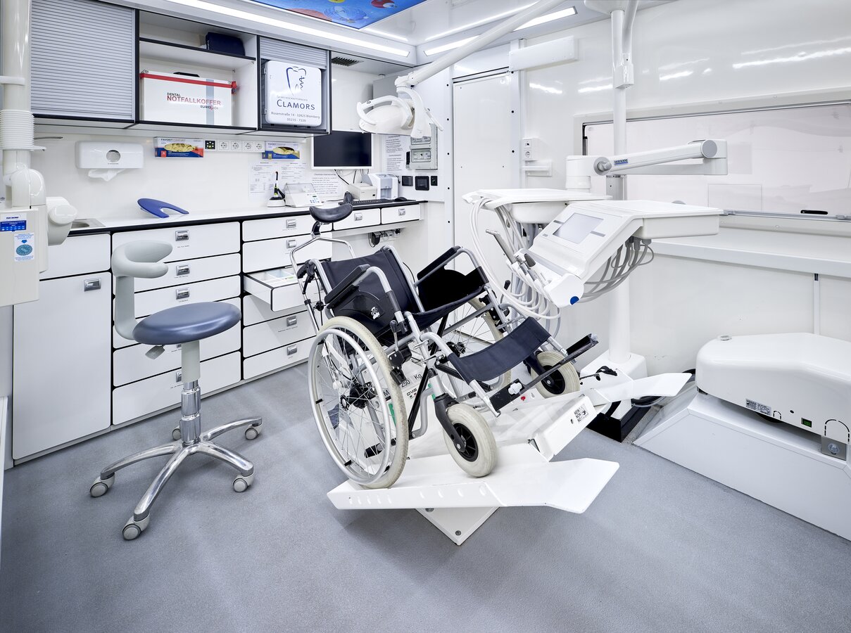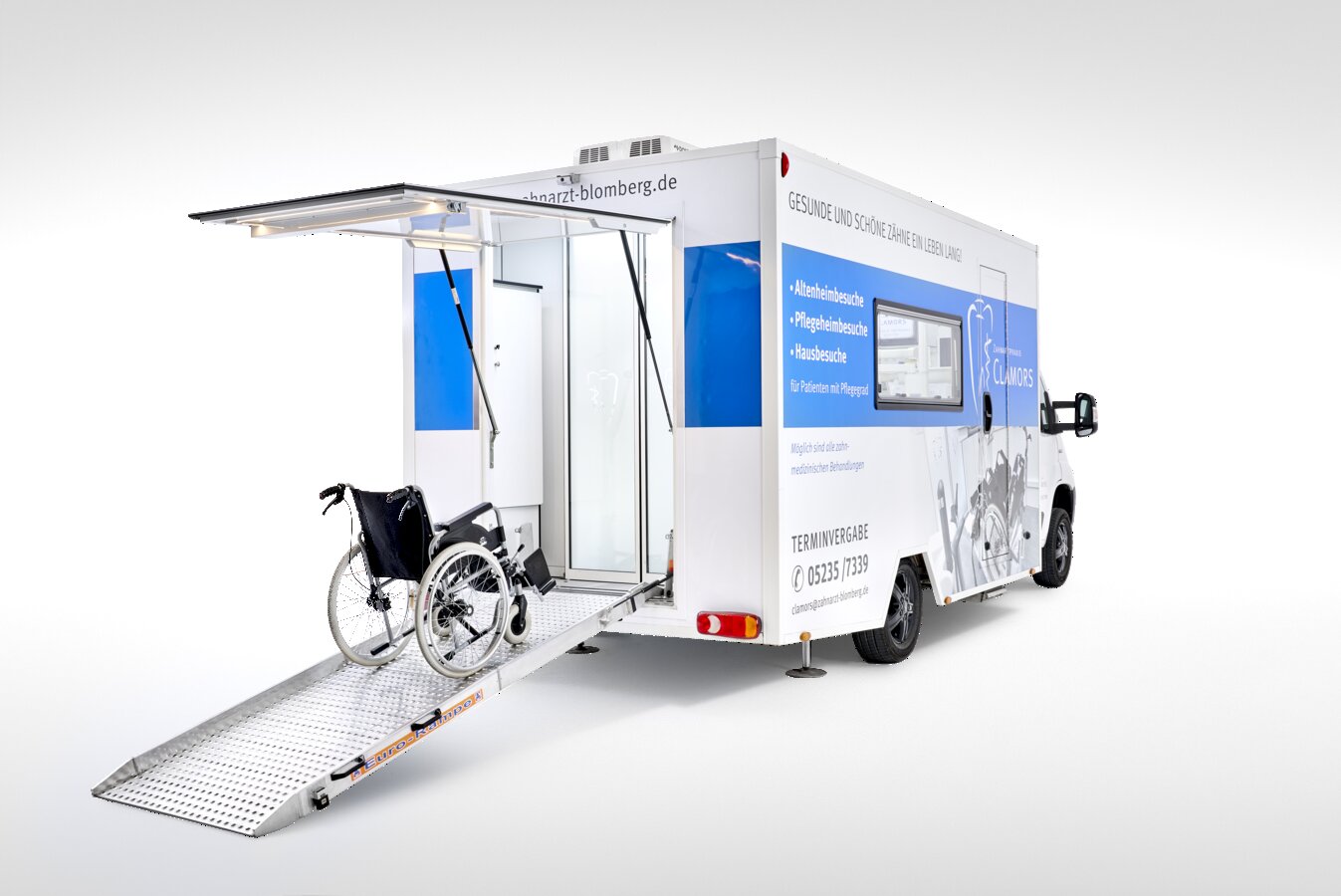 Dental treatments for care home residents or geriatric ward patients can be a real challenge. The dentists from the Clamors dental practice in Blomberg, Germany, have conquered the problem with a mobile dental practice based on an AL-KO low-frame chassis, the so-called BUMV (German abbreviation for Treatment and Medical Care) mobile. This has simplified barrier-free access and local care for senior citizens with limited mobility, as well as for dementia patients.